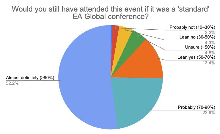 - Some attendees appreciated the increased density of relevant people and content while others noted the decreased opportunity for sharing knowledge across cause areas.