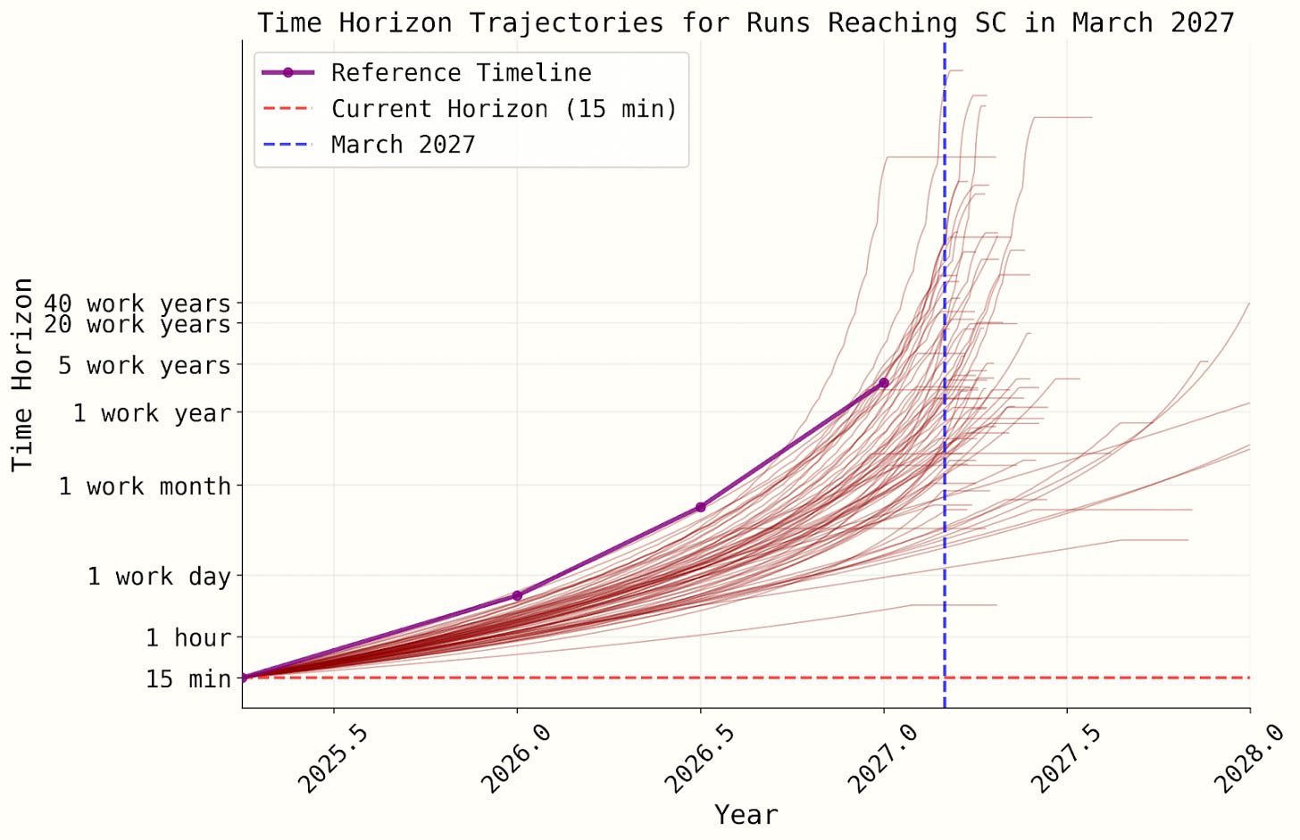 - The AI 2027 authors assign ~40% probability to a “superexponential” time horizon growth curve that shoots to infinity in a few years, regardless of your starting point.