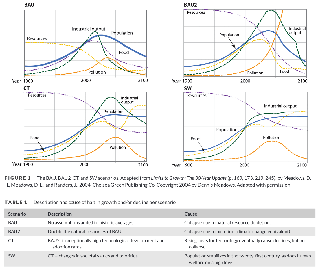 I think it would be helpful to see an overlay of our actual trajectory. Though the absolute values of the models are not that different for the period 2000 to 2020, the slopes are quite different. I think there was a paper analyzing the fits including the slopes. The increase of production of food since the year 2000 has been much larger than any of the models predicted. Also, I think the increase in industrial capacity is higher than any of these models. Interestingly, some people interpret this as us overshooting farther, so then we will fall more dramatically. But because we generally have not seen reduction in slopes, I don't really see evidence for this, so I think that the optimistic interpretation is more likely to be right, basically that we have innovated around limits to growth so far.