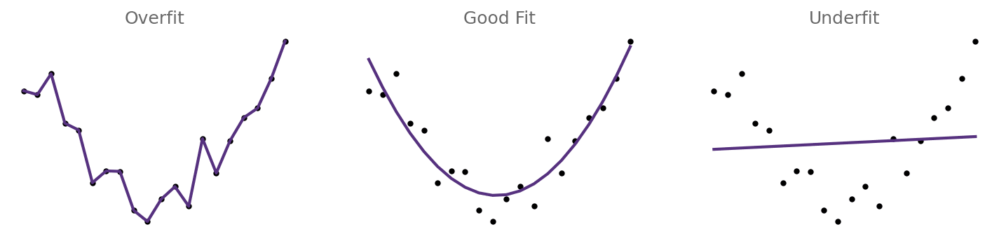 Both kinds of models run into the problem that it is very difficult to find the right number of parameters, as well as their correct values, both for the behavior of the individuals in the agent-based modeling, but also for the feedback mechanisms in world models. You need enough parameters to be able to accurately model your data, but the more parameters you have, the more data you need to meaningfully constrain their values. This means you have a trade-off between underfitting and overfitting (Figure 1), which is hard to get right.