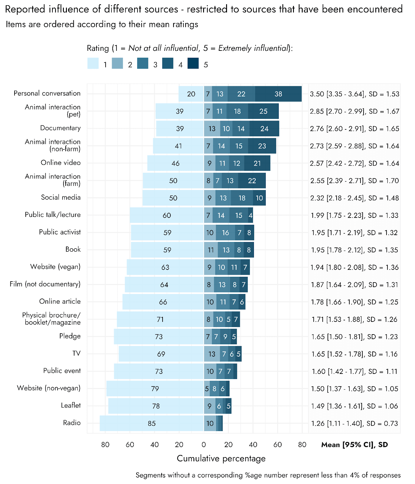 When we asked current vegetarians/vegans what influenced them to adopt their diet, personal conversations (primarily with friends/family) were among the top influences.