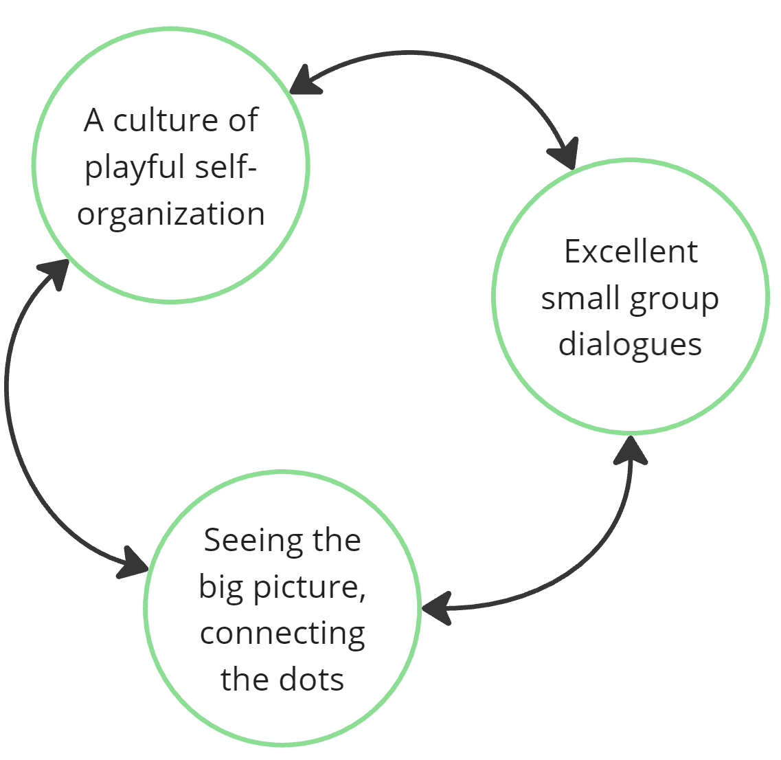 - Abundant ‘craft materials’ needed to self organize—the Slack, the empty rooms, projectors, whiteboards, stickies, markers