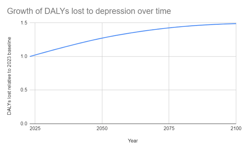 Secondly, I calculate the proportion of disease burden that will remain after being counterfactually solved – or in fact, because the problem will grow, the increased disease burden over time. To do this, I use a simple theoretical model that treats total DALYs lost to depression as a function of DALYs lost per capita and population size.