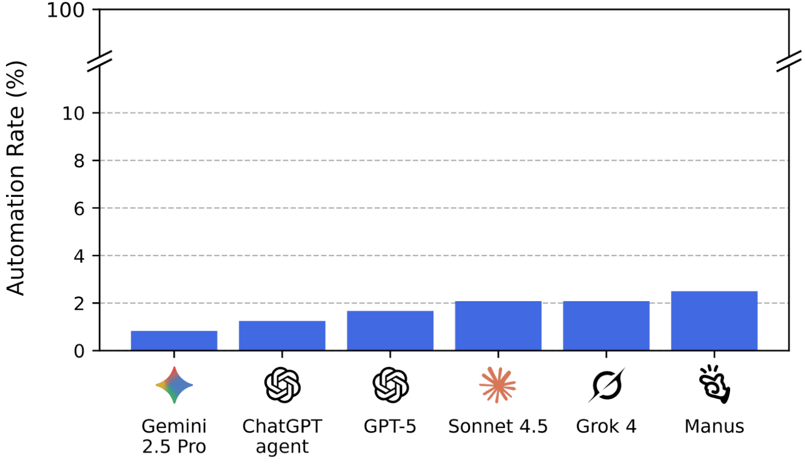 AI agents currently automate relatively few remote work projects on RLI, with the highest scoring model, the Manus agent, completing 2.5% of projects at a professionally acceptable level. Newer and more advanced agents show signs of improved accuracy over older ones and more consistently make progress on the projects.