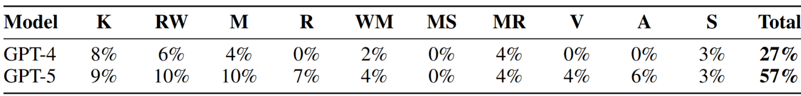 Column labels are acronyms corresponding to the above cognitive categories on the radar chart. GPT-5 displays several new abilities that GPT-4 did not have.