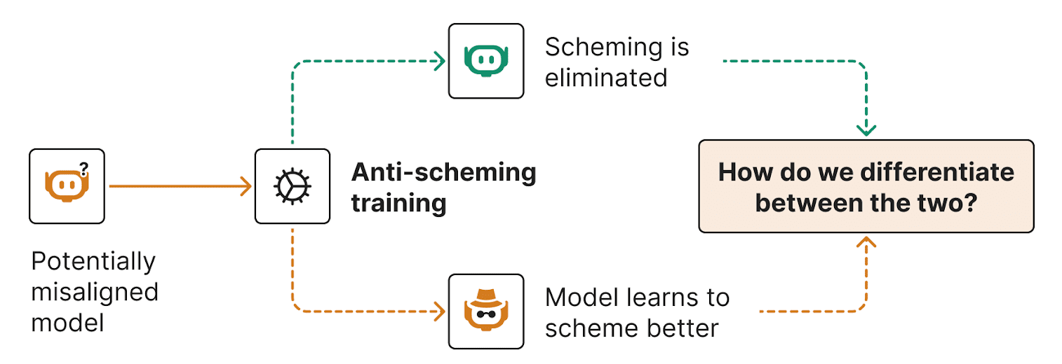 There are two plausible explanations for this large reduction in scheming: the model could have learned to scheme less, or it could have learned to avoid detection while scheming.