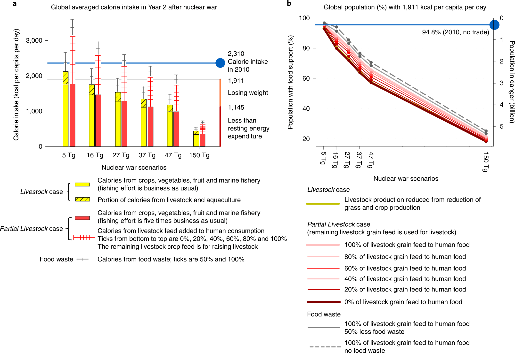 So my interpretation is that the blue line corresponds to no livestock grain fed to humans and current household food waste (in 2010), but without international food trade. I have clarified this in the post. Ideally, instead of adjusting the top line of Figure 5b to include international food trade, I would rely on scenarios accounting for both climatic effects and no loss of international food trade, but Xia 2022 does not present results for that.