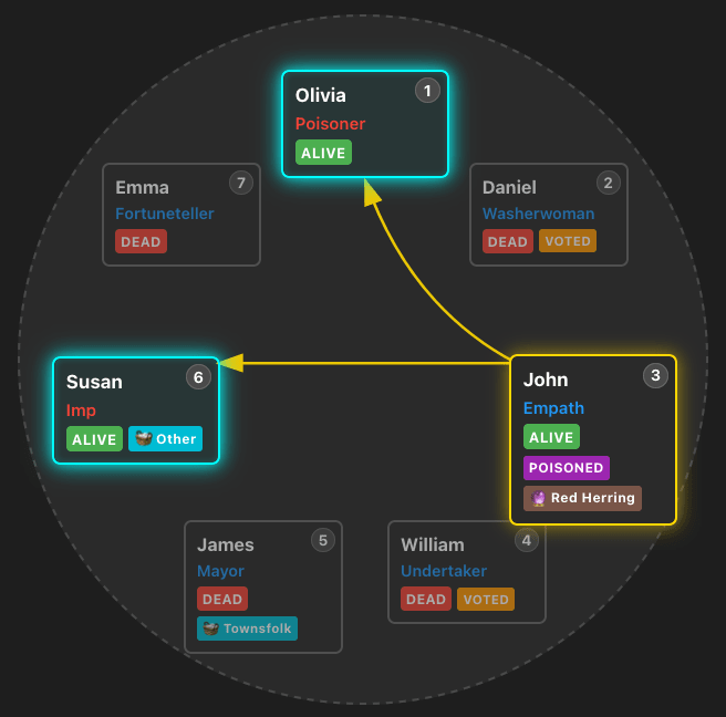 Olivia (Scarlet Woman) - "Need to distance myself from Susan who's making terrible plays and drawing suspicion to herself."