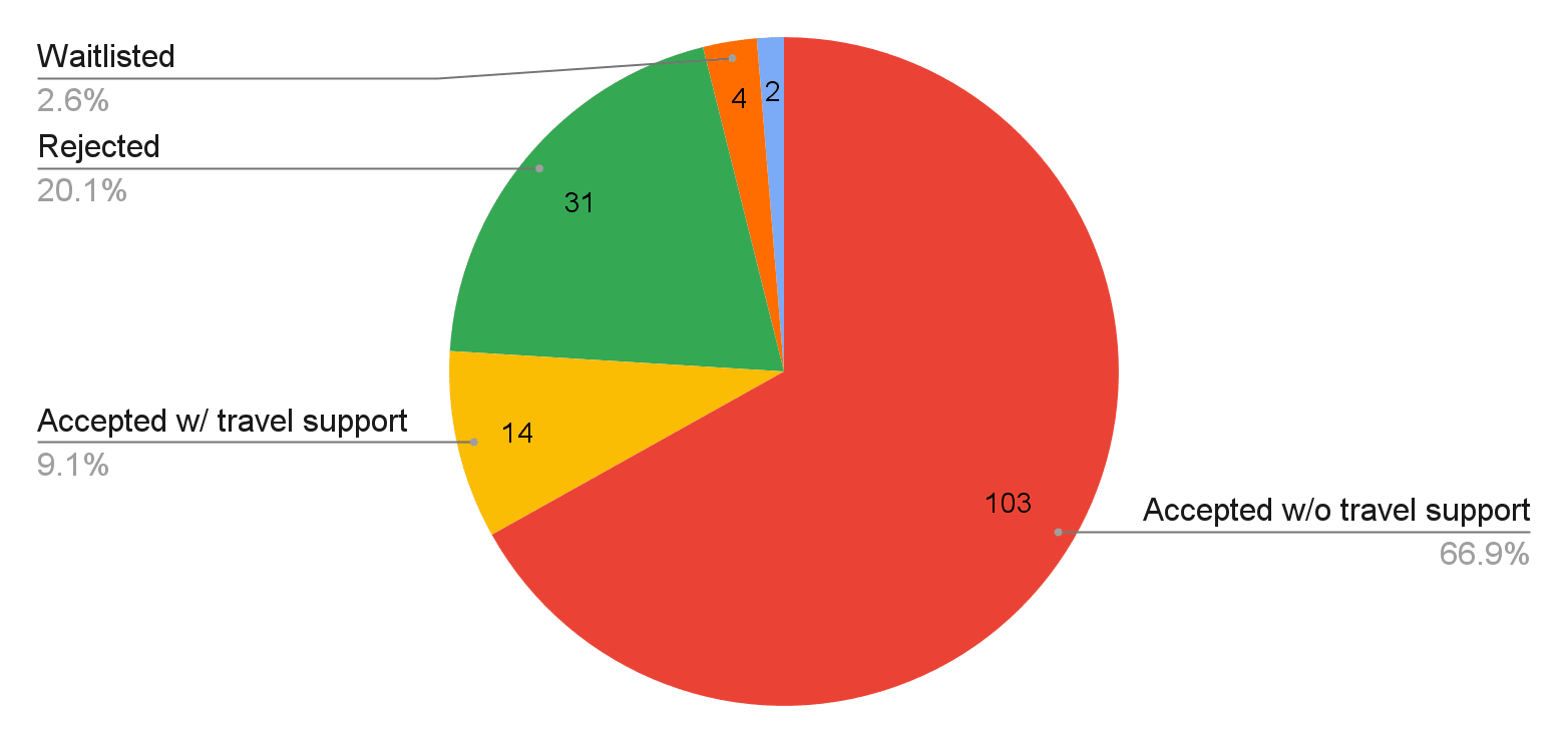 - There were 14 people accepted with travel support, of which 11 attended. This is a 21% dropoff rate. We have high confidence that this is largely due to acceptances being sent out too close to the event date, and acceptance emails going to spam, delaying our communications.