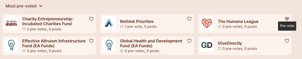 If you had a Forum account as of 22 October 2023,[8] you can already start pre-voting for candidates you’re likely to vote for (pre-votes are anonymous, don’t turn into real votes, and you can change them at any time). Pre-voting will change the default ordering of candidates on the Giving Portal and will show other people which candidates are likely to be popular — which can prompt useful discussions and surface important disagreements.