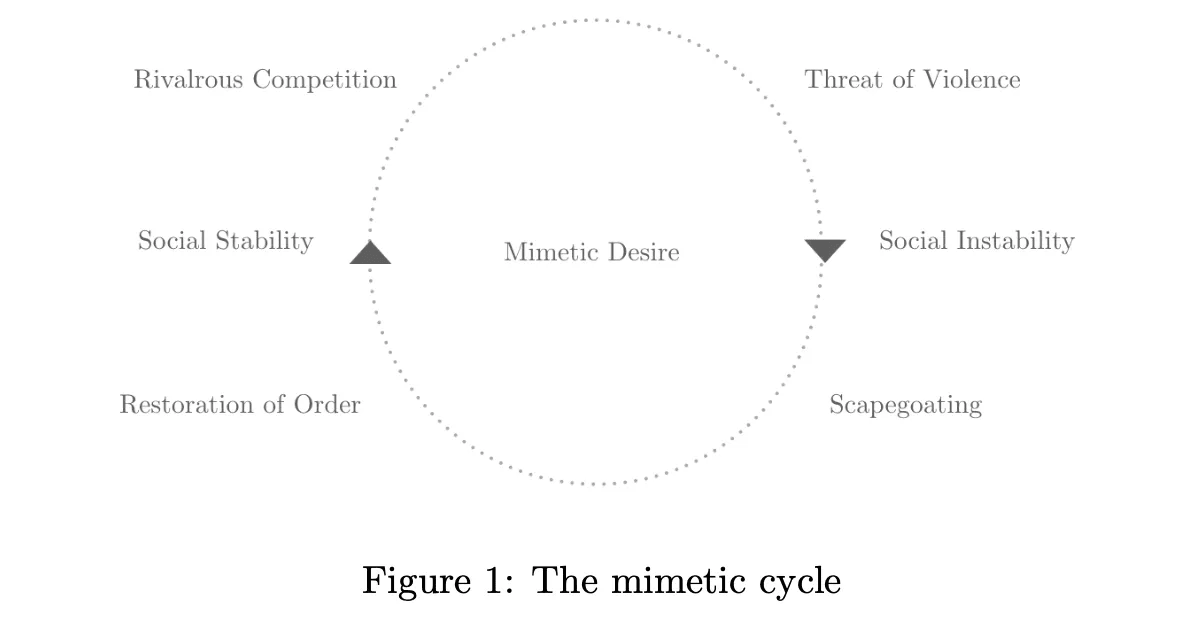 - The cycle of violence can be reset through the sacrifice of a scapegoat. Unfortunately (?), Christian society does not let us sacrifice random scapegoats, so we are trapped in an ever-escalating cycle, with only poor substitutes like “cancelling celebrities on Twitter” to release pressure. Girard doesn’t know what to do about this.