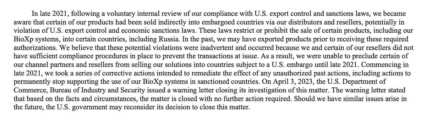What is actually being done? Unfortunately for all of us, every federal document governing DNA synthesis security in the United States right now is (somewhat) voluntary, though there is a nuance here we’ll get to in a bit. The only binding rules are export controls, which have, circa 2026, already been violated. The IFP essay from earlier happily reports that Telesis disclosed in their SEC filings that their DNA assembly systems have accidentally ended up in embargoed countries through distributors.