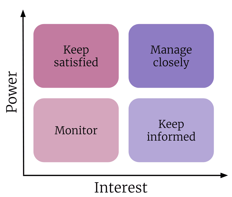 A common tool is Mendelow’s matrix, also called the power-interest matrix. In this matrix, your stakeholders can be mapped across two axes: How much power they have over your organisation, and how much interest they have in your work.