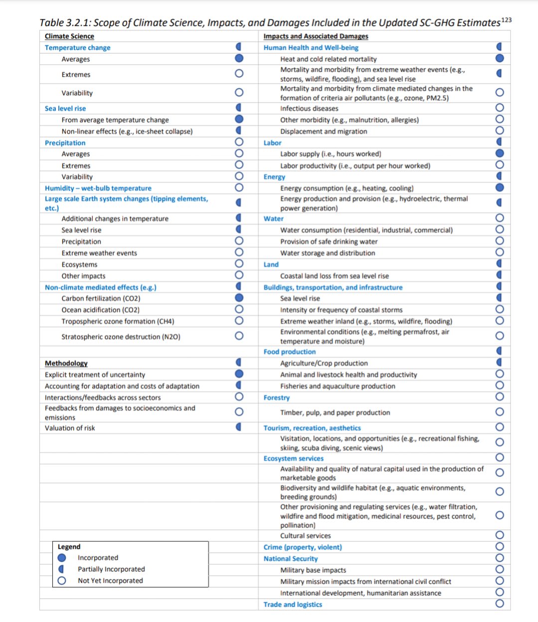 One of the most recent attempts to compute an updated SCC in a government policy context was the US Environment Protection Agency (EPA) who published a 137 page pdf considering the latest state of SCC research as of September 2022. All the way down on page 79 of the PDF is this incredible summary table which shows which kinds of damage have been accounted for by the SCC estimates produced in the report: