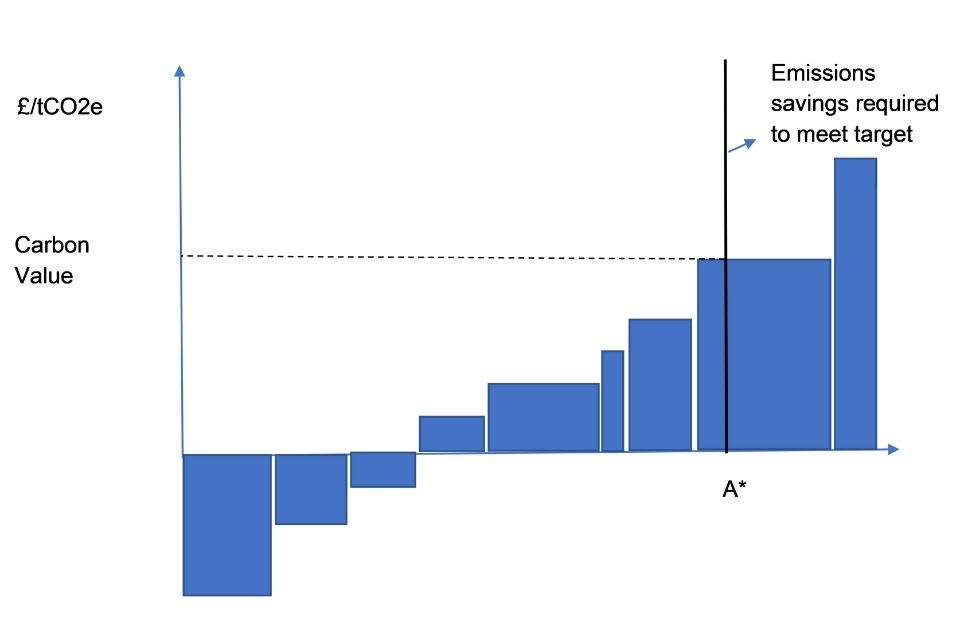 (Illustrative MAC curve - the height of each bar is the £/tCO2e of each intervention, and the width represents the scale of the available intervention. A* is the point where the cumulative emissions savings of interventions adds up to the emissions savings required to meet the target at the lowest possible price.)