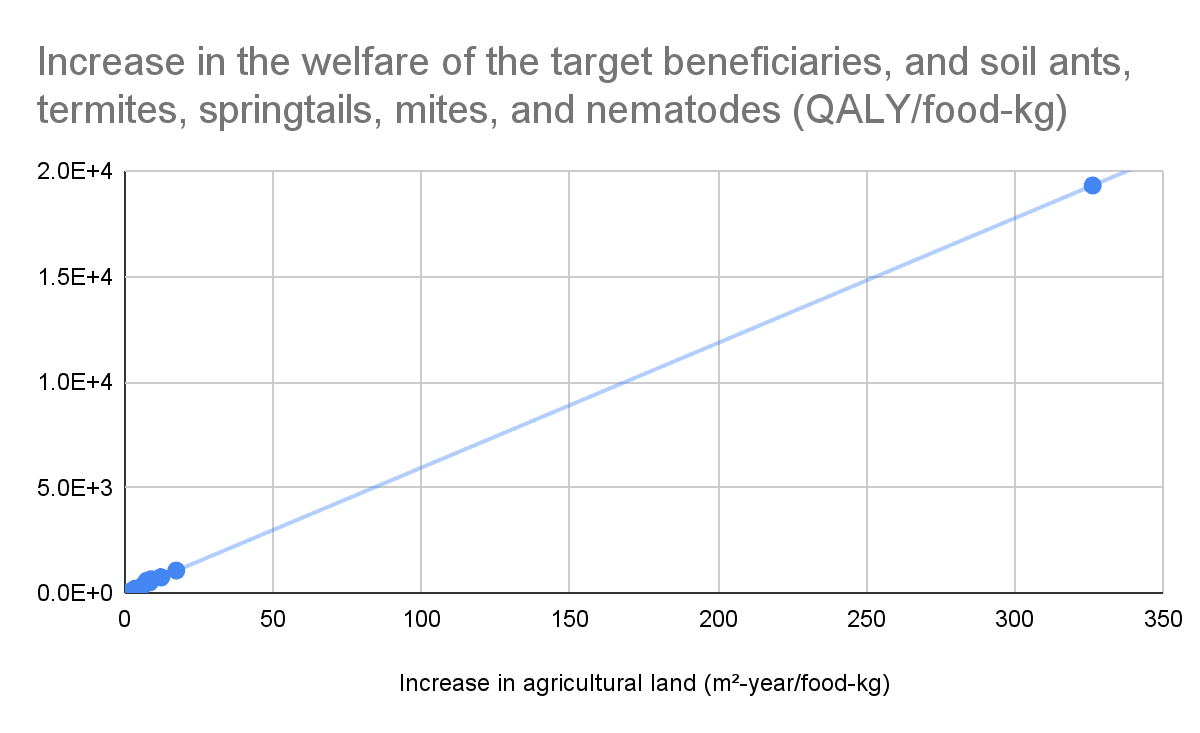 The logarithm of the increase in agricultural-land-years per food-kg explains over 90 % of the variance in the logarithm of the absolute value of the change in the welfare of the directly affected animals, and soil ants, termites, springtails, mites, and nematodes per food-kg for an exponent of the number of neurons up to 1.43. In other words, one can predict this absolute value of the change in welfare per food-kg from the increase in agricultural-land-years per food-kg alone for those exponents. This is because the effects on soil animals are much larger than those on the directly affected animals in this case, and the increase in the welfare of soil animals per unit area is similar.