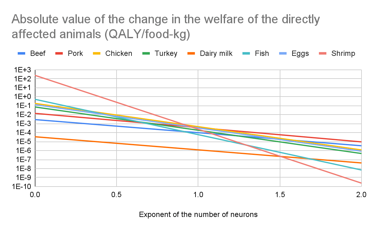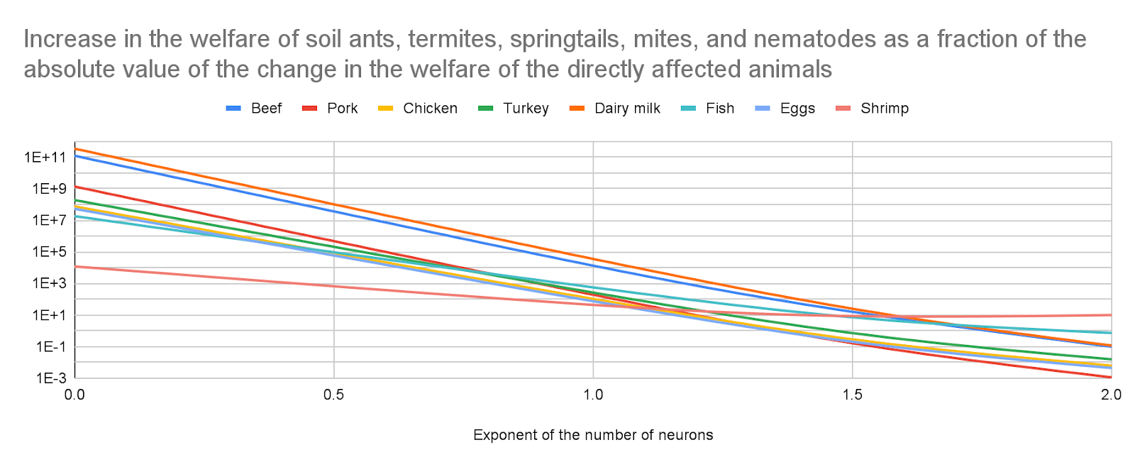 - For all the animal-based foods I analysed besides shrimp, I estimate effects on soil animals would still be much larger than those on the target beneficiaries for a welfare per animal-year of exactly 0 for animals with fewer neurons than those considered in Bob’s book, and an exponent of the number of neurons of 0.19 which explains very well its estimates. I calculate soil ants and termites have 2.91 and 1.16 times as many neurons as shrimp, so effects on them would still be relevant. I get the following absolute value of the change in the welfare of soil ants and termites as a fraction of the absolute value of the change in the welfare of the directly affected animals for an exponent of 0.19: