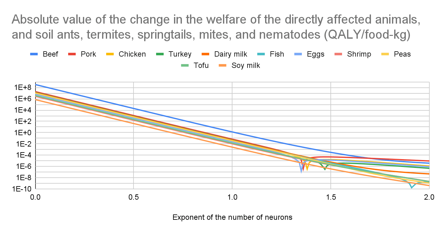 I conclude producing beef increases the welfare of the directly affected animals, and soil ants, termites, springtails, mites, and nematodes (considered all together) much more than the other foods for any exponent of the number of neurons. The production of beef, dairy milk, peas, tofu, and soy milk increases their welfare for any exponent. The production of pork, chicken, turkey, fish, and eggs increases it before the sharp points below, and decreases it afterwards. The minimum exponent to decrease their welfare is 1.36 for pork, 1.39 for chicken, 1.47 for turkey, 1.92 for fish, 1.35 for eggs, and higher than 2 for shrimp.