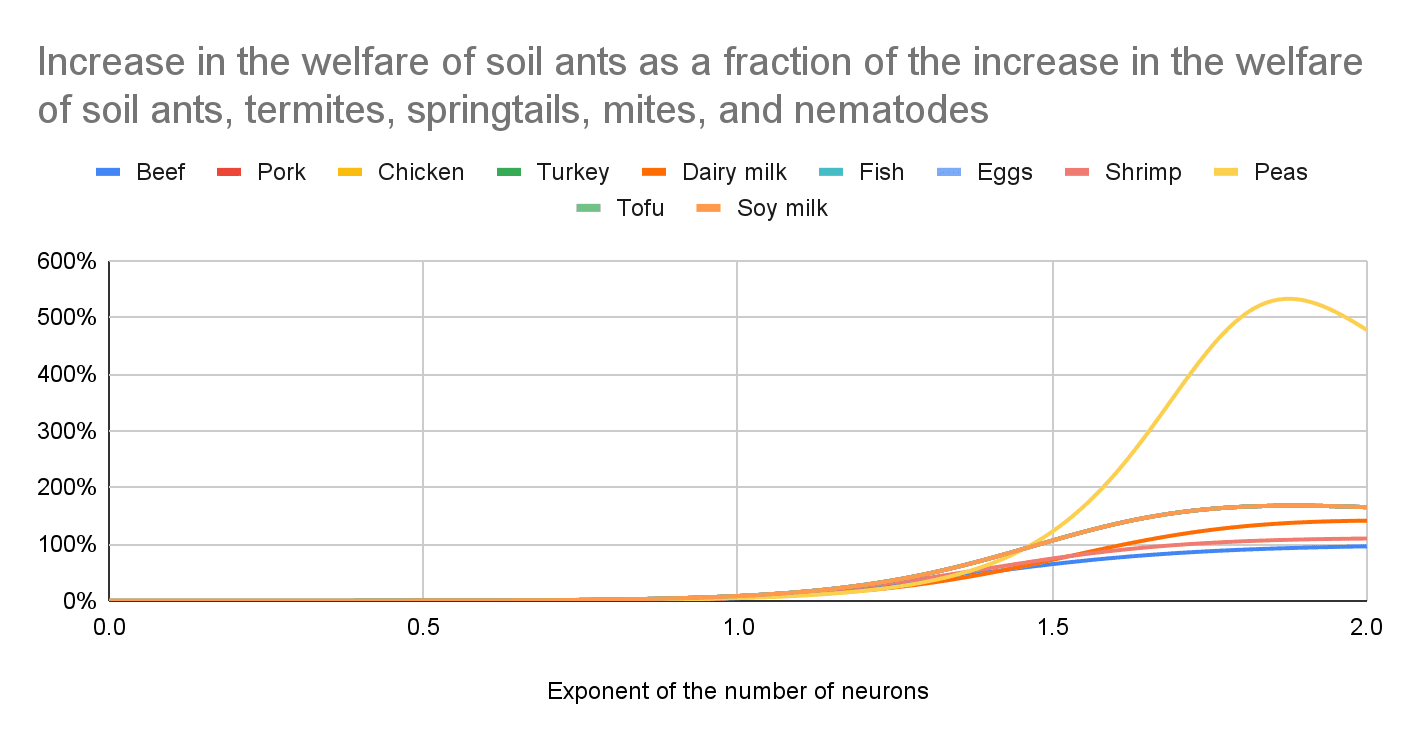 - I believe effects on soil animals are much larger than those on the directly affected animals. I am confident the exponent of the number of neurons is the parameter which affects the ratio between the effects on soil animals and directly affected animals the most by far, and effects on soil animals dominate at least for values of the exponent up to 1, which are the ones I consider plausible. I get the following increase in the welfare of soil ants, termites, springtails, mites, and nematodes as a fraction of the absolute value of the change in the welfare of the directly affected animals (a value over 1 implies the effects on soil animals are larger than those on the directly affected animals). For an exponent of the number of neurons of (the lower and upper bound respect shrimp and dairy milk):