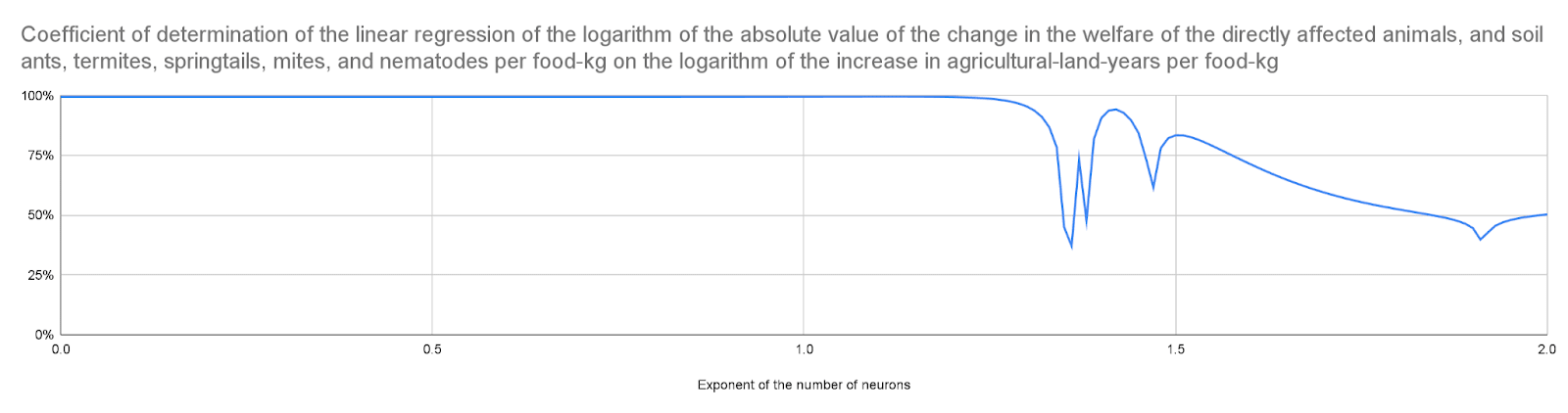 - The logarithm of the increase in agricultural-land-years per food-kg explains over 90 % of the variance in the logarithm of the absolute value of the change in the welfare of the directly affected animals, and soil ants, termites, springtails, mites, and nematodes per food-kg for an exponent of the number of neurons up to 1.43. In other words, one can predict this absolute value of the change in welfare per food-kg from the increase in agricultural-land-years per food-kg alone for those exponents. This is because the effects on soil animals are much larger than those on the directly affected animals in this case, and the increase in the welfare of soil animals per unit area is similar.