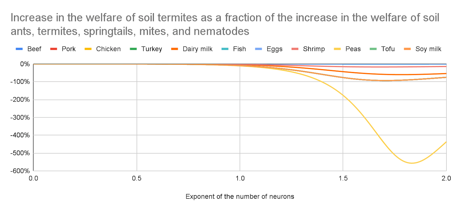 The production of beef and shrimp increases the welfare of soil ants and termites for any exponent. The other animal-based foods decrease it before the sharp points below, and increase it afterwards.