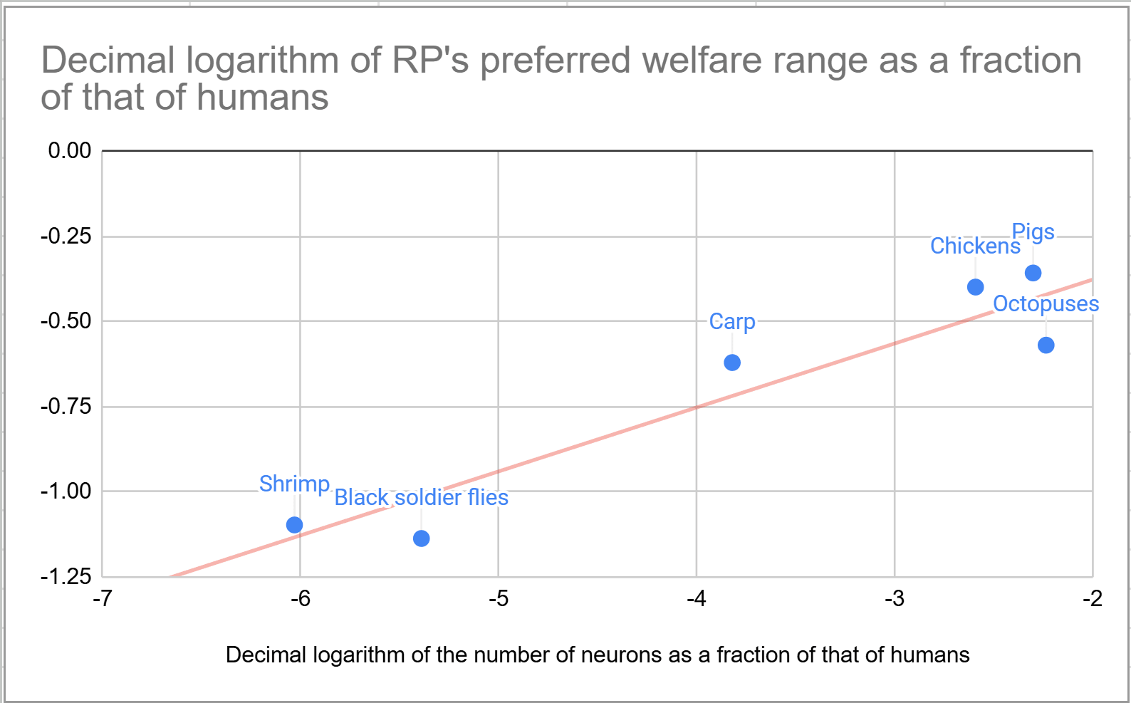 RP’s moral weight project included a report by Adam Shriver concluding “there is no straightforward empirical evidence or compelling conceptual arguments indicating that relative differences in neuron counts within or between species reliably predicts welfare relevant functional capacities”. I guess there are other factors besides the number of neurons that influence the welfare range. However, an exponent of 0.188 explains 78.6 % of the variance of the estimates in Bob’s book. I get this exponent from the slope of the below linear regression with null intercept of the logarithm of RP’s preferred welfare range as a fraction of that of humans on the logarithm of the number of neurons as a fraction of that of humans. I rely on a simple formula for the welfare range to decrease noise, and easily obtain estimates for animals not covered in the book to explore implications for cause prioritisation.
