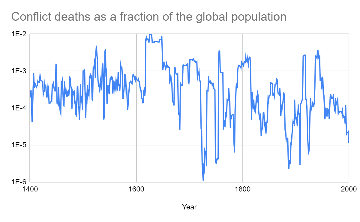 It is also unclear from past data whether annual conflict deaths as a fraction of the global population will increase.