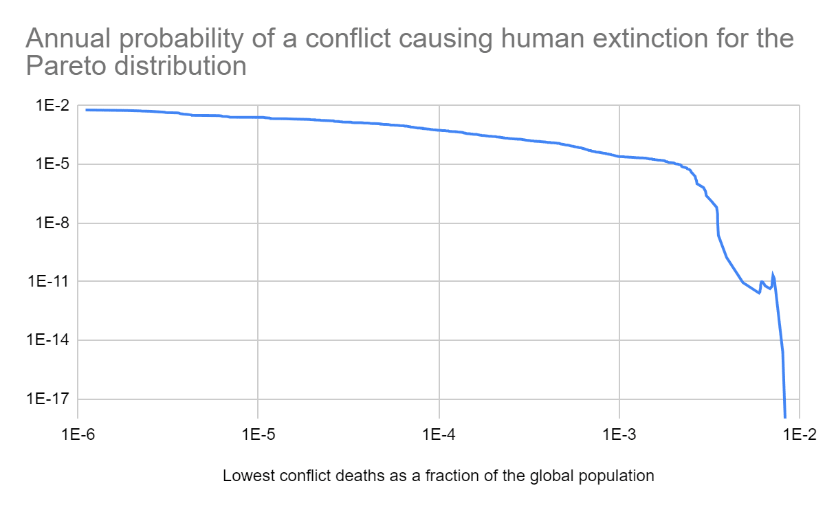 Fitting a power law to the N rightmost points of the tail distribution of annual conflict deaths as a fraction of the global population leads to an annual probability of a conflict causing human extinction lower than 10^-9 for N no higher than 33 (for which the annual conflict extinction risk is 1.72*10^-10), where each point corresponds to one year from 1400 to 2000. The 33 rightmost points have annual conflict deaths as a fraction of the global population of at least 0.395 %. Below is how the annual conflict extinction risk evolves with the lowest annual conflict deaths as a fraction of the global population included in the power law fit (the data is here; the post is here).