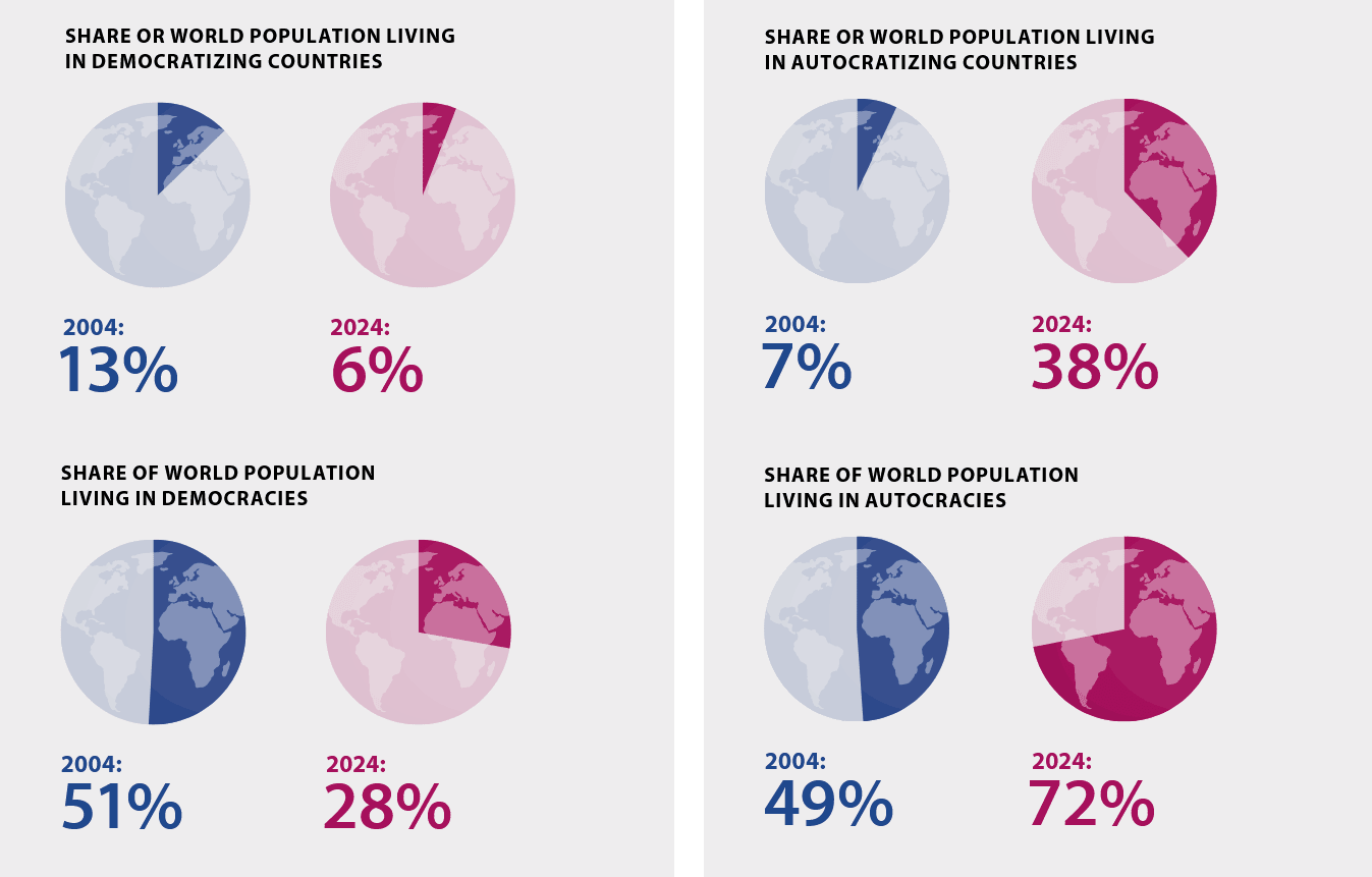 But this tendency is visible not only in the number of countries, but also in the number of people affected. In 2004, 13% of the world’s population lived in democratizing countries; by 2024, that figure had fallen to just 6%. The share of the global population living in autocratizing countries increased from 7% to 38%. In 2004, 49% of people lived in autocracies and 51% in democracies. By 2024, these numbers had shifted dramatically: only 28% of people lived in democracies, while 72% lived in autocracies. Two especially populous countries, India and Brazil, had a major influence on these figures. For 2025, developments in the United States will have a major impact on the measurements.