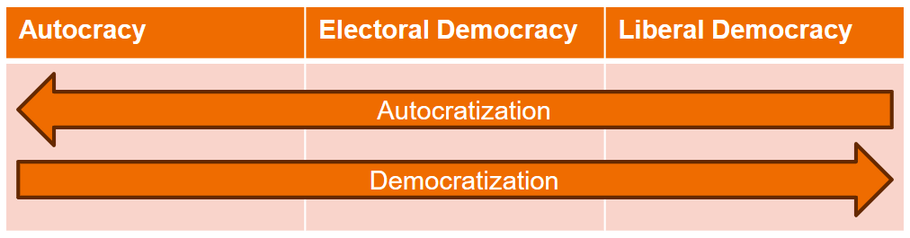When the democratic qualities of a political system decline, we speak of autocratization. Autocratization can occur both in democracies and in autocracies: democracies become less democratic, and autocracies become even more authoritarian. Autocratization of an autocracy is called autocratic deepening, while autocratization of a democracy is called democratic backsliding.