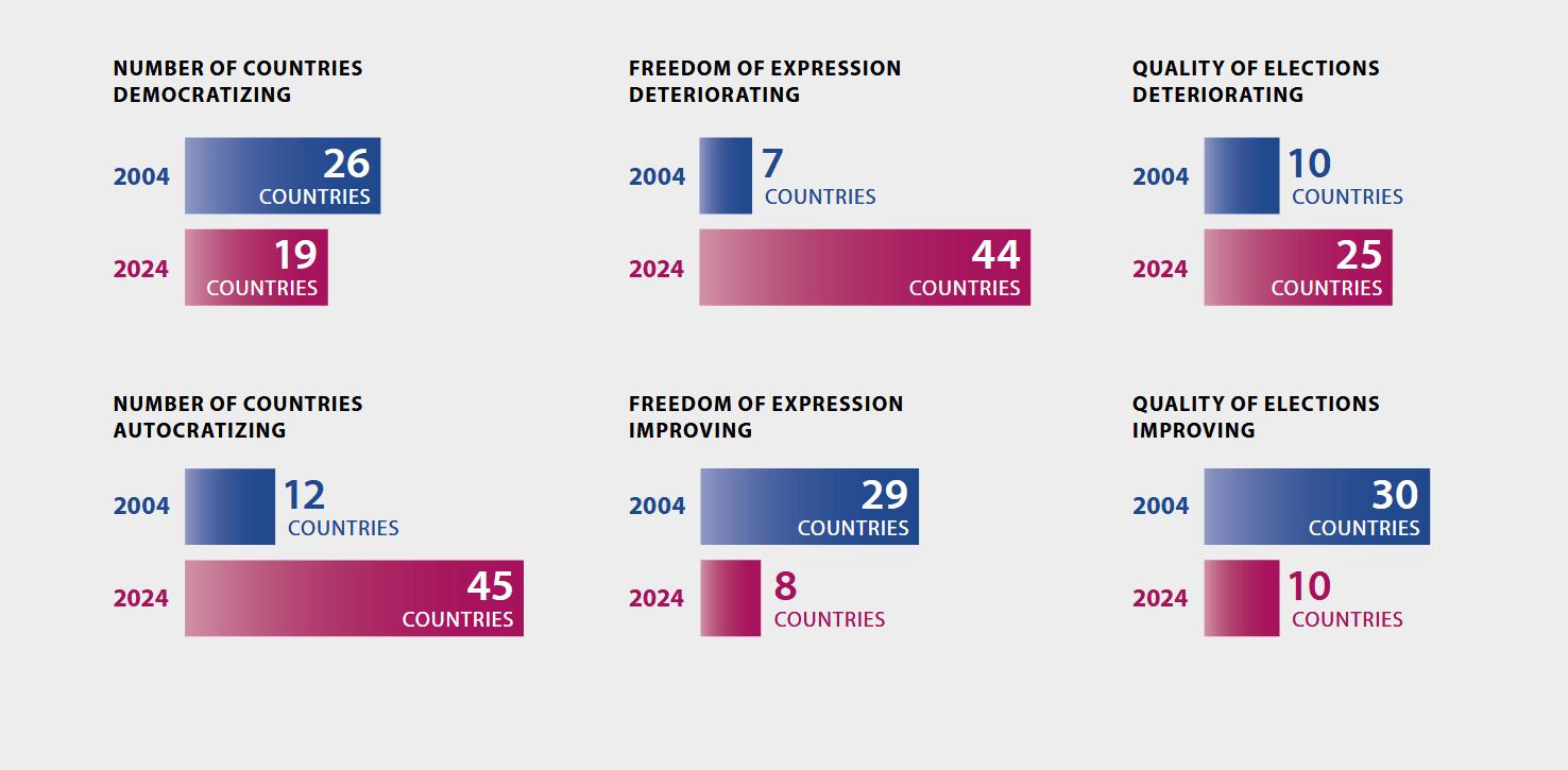 Comparing 2024 with 2004, we see a significant decline in the number of democratizing countries, from 26 to 19. Over the same period, the number of autocratizing countries rose from 12 to 45. The same trend can be observed for freedom of expression and for the quality of elections.