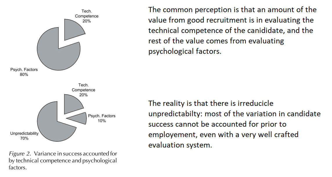 In a similar vein, here is my paraphrasing of the same idea from Personnel Selection: Adding Value Through People: In hiring, the very best methods of predicting performance only account for about 25% to 33% of the variance in performance. It may not be realistic to expect more. This is primarily because performance at work is influenced by other factors that are orthogonal to the individual (management, organizational climate, co‐workers, economic climate, the working environment).