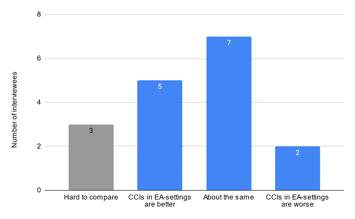 - They had quite similar CCI experiences in both EA and non-EA settings. This makes it hard to tell which of the two settings have the higher average (or better average CCI experience).