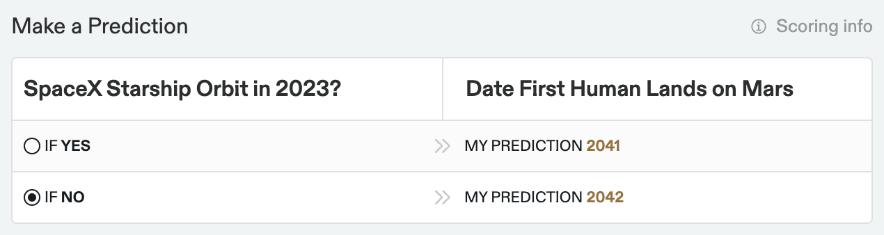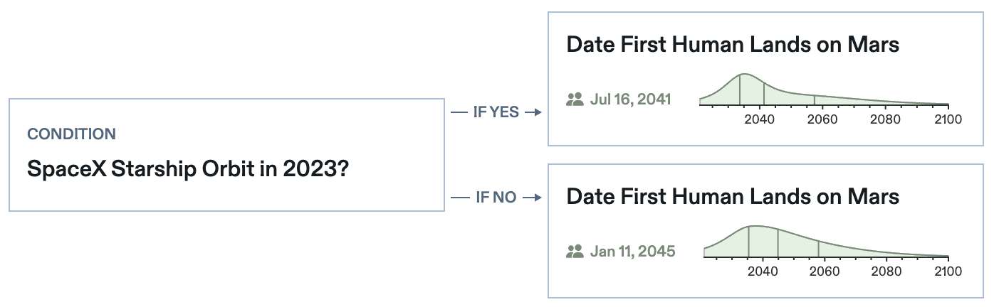Conditional continuous questions give you the tools to explore how events like these could be probabilistically linked, enabling you to forecast when we reach Mars in the case where SpaceX reaches orbit and in the case where it doesn't.