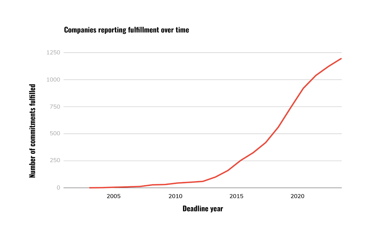 This graph tells a story about what it really takes to create lasting change. It took a decade of hard work with little reward before success spiralled upwards, but a snowball effect was set off a little before 2015, with enough major retailers and restaurant chains making commitments that others were pressured to follow. Where EA and our allies have led, companies like McDonald's have finally followed.
