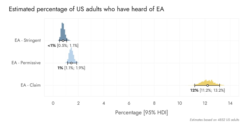 - Awareness of EA remains low, with only 1–2% of Americans familiar with EA. By more actively sharing our stories and principles, both as institutions and individuals, we can inspire others to join in creating positive change.
