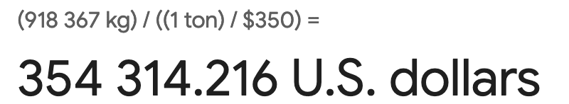918,367 kg = MONEY × 1 ton / $350.