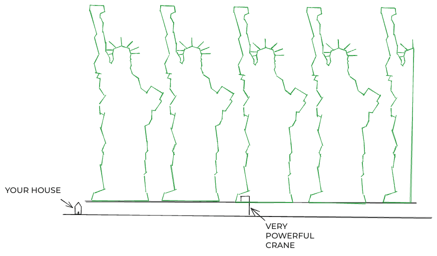 As it happens, 1 million kg cranes do exist. But even used, they’ll set you back another million dollars or so. If you’re going to get one of those, then may I suggest that the same weight is given by almost exactly 4.5 Statues of Liberty? So I suggest you also consider this option (drawn to scale):