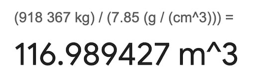 That’s 65× more than just buying a 20 kWh home battery. But let’s say you’re committed to the bit. How big would that block be? Some searching reveals that the density of steel is around 7.85 g/cm³. So if you have a cubic block of volume VOLUME, then