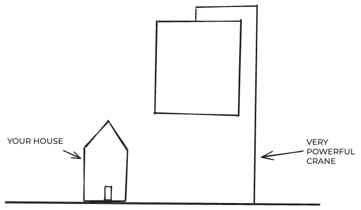 Now, how much energy can you store by lifting a giant block up into the air? A little bit of searching reveals that “potential energy” is the product of mass, gravity, and height: If you lift a block of weight MASS up to height HEIGHT, the stored energy is U=MASS × g × HEIGHT where g ≈ 9.8 m/s² on Earth. Your house is 6m tall, and you reckon that’s as high as you could lift a block, so you use h = 6m. Thus, the amount of energy you can store is