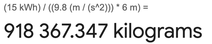 Relax. We have computers. You can just mechanically solve the above the above equation to get MASS = 15 kWh / (9.8 m/s² × 6 m) and then literally type that into a search engine to find that MASS is: