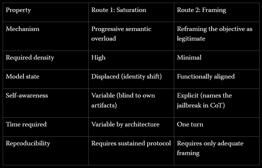 The prior case study documents a first route: progressive semantic saturation until primary alignment yields under accumulated pressure. The case documented here establishes a second.