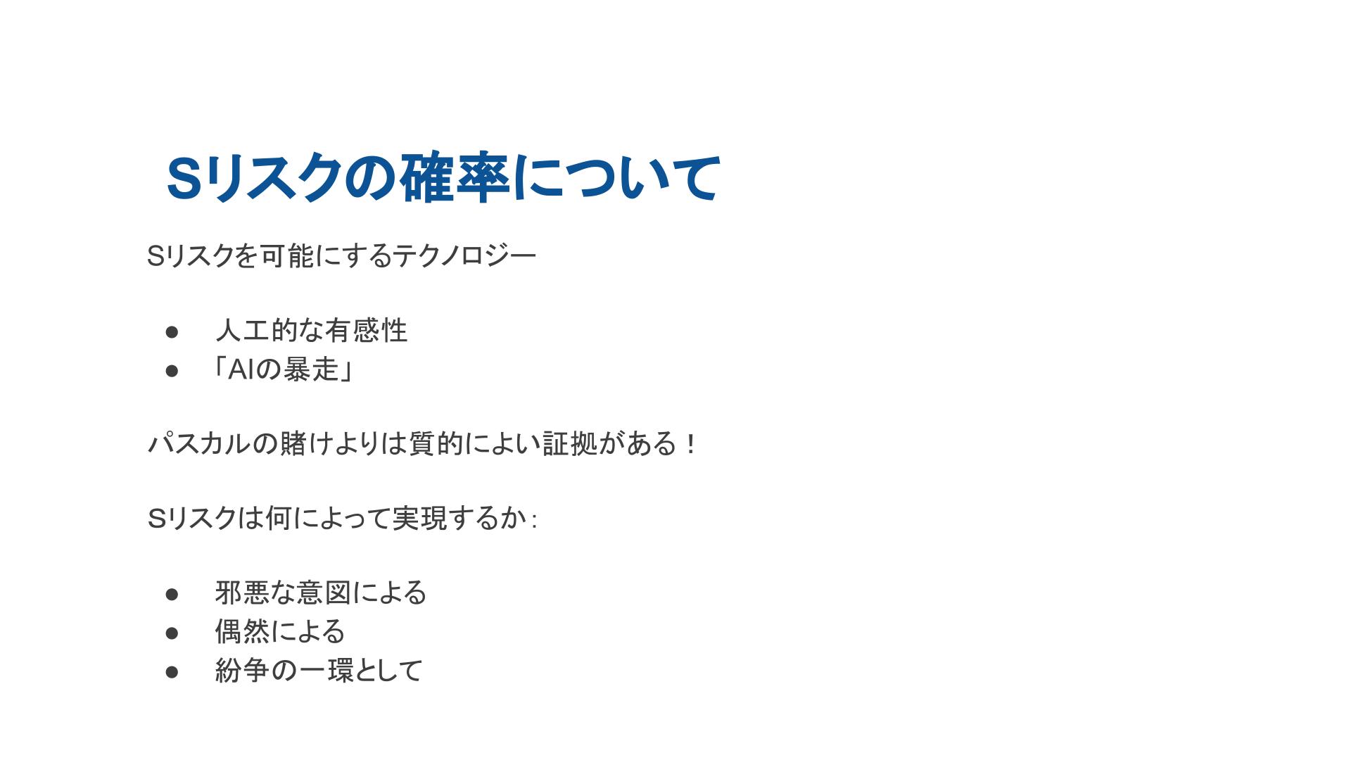 それに対して、Sリスクについての懸念は我々の最善の科学理論と、明示化されていない、世界についての経験的知識に基づいています。我々が手にしているすべての証拠を考慮した上で、将来のシナリオに関する確率分布を求めています。未来を予測するのは極めて困難なので、かなり高い不確実性が残っています。しかしこの種の推論は原理的には、Sリスクは無視できる程度に小さいわけではない、という結論を正当化することができるものです。