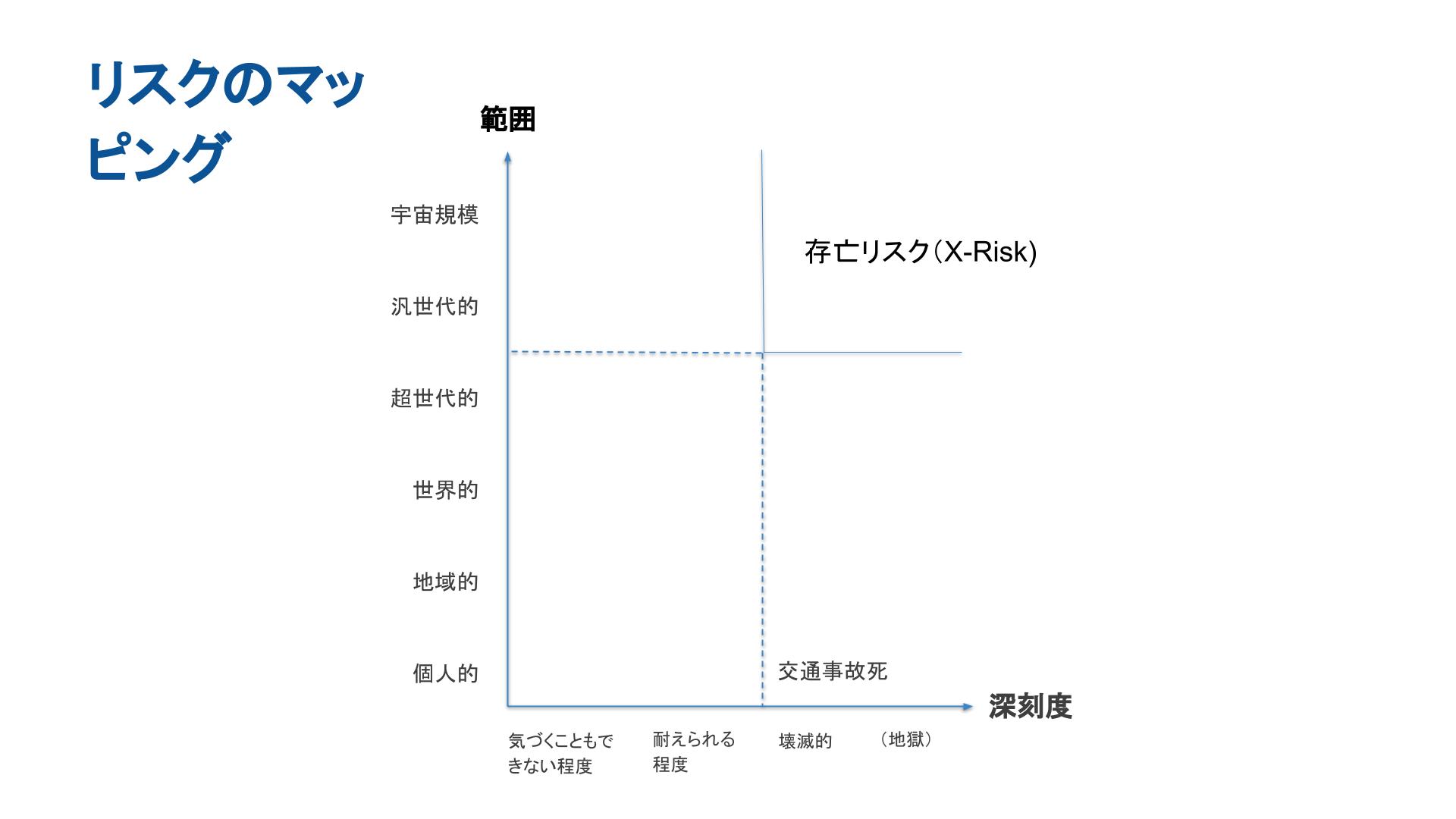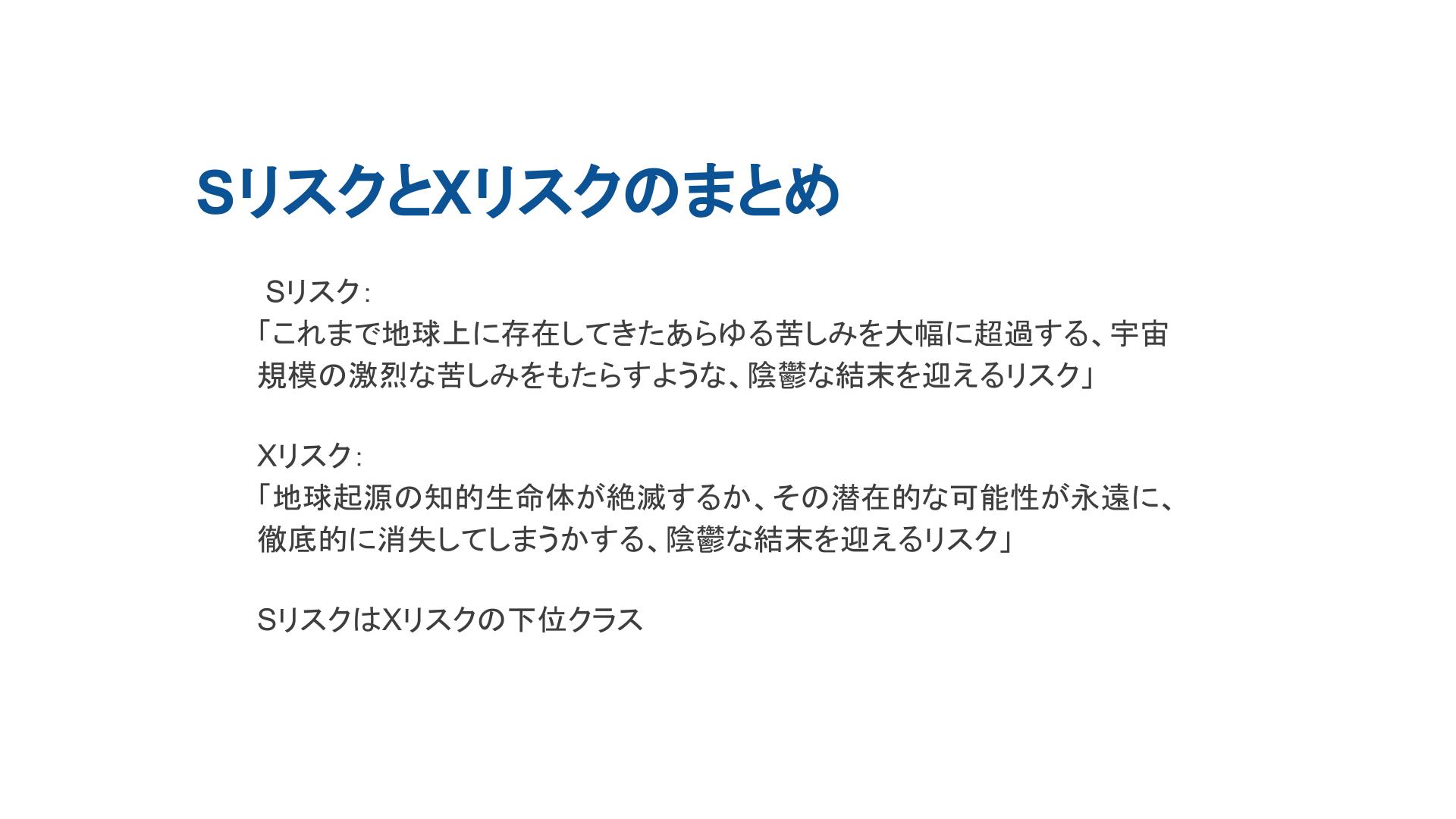 これでようやく、私の講演タイトルに話を戻し、なぜSリスクが最悪の存亡リスクなのかを説明することができます。Sリスクが最悪の存亡リスクである理由は、それは可能な限りで最大の範囲と最大の深刻度をもつものとして定義されるからです。(Sリスクは最悪のXリスクであるという主張には後で留保をつけます。)すなわち、私は次の定義を提案します。
