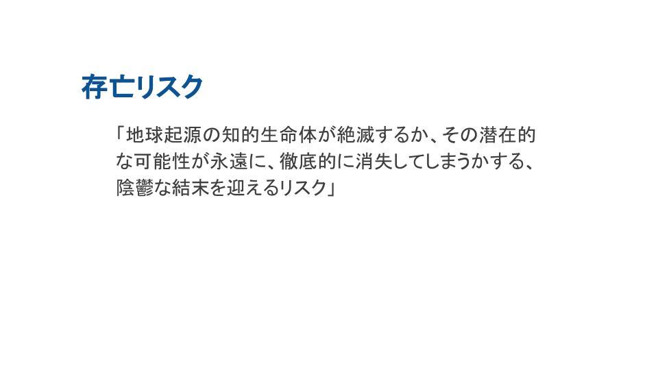 「存亡リスク ── 地球起源の知的生命体が絶滅するか、その潜在的な可能性が永遠に、徹底的に消失してしまうかする、陰鬱な結末を迎えるリスク」