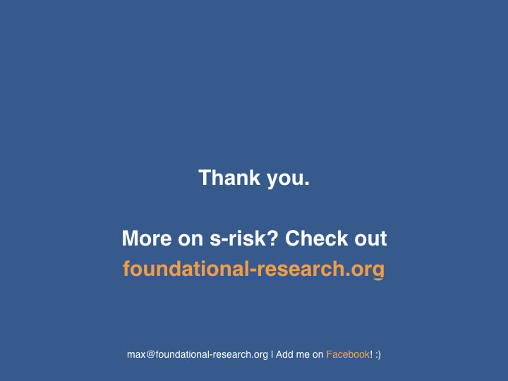 Sリスクについてさらに情報を得たい方は foundational-research.org をご覧ください。何か質問があれば、私 max@foundational-research.org まで気兼ねなくメールを送ってください。あるいは Facebook から連絡を取っていただいても構いません。