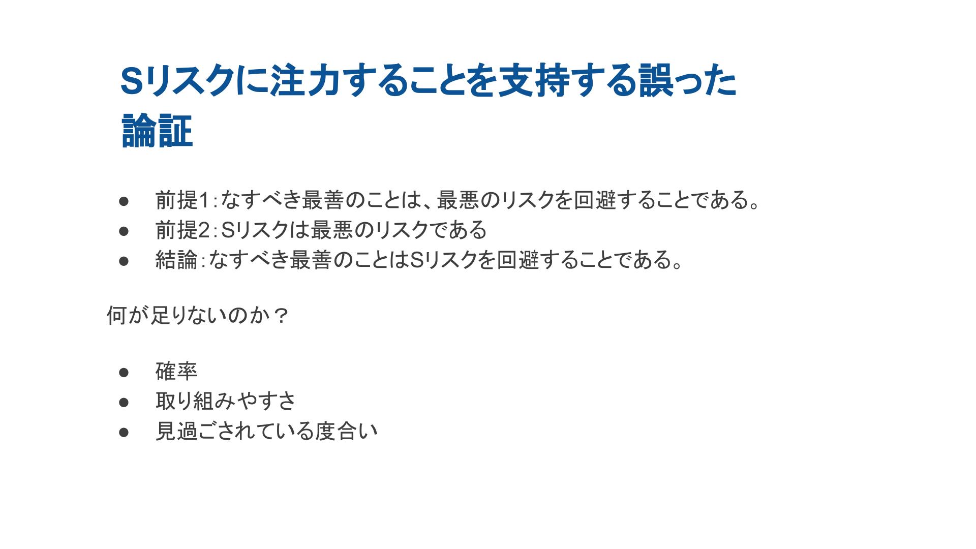 これらの追加の規準は明らかに重要です。例えば、もしSリスクの確率がゼロなら、あるいはSリスクの軽減が全く取り組みがたいものであるとしたら、Sリスクを軽減しようとすることに何の意味もありません。