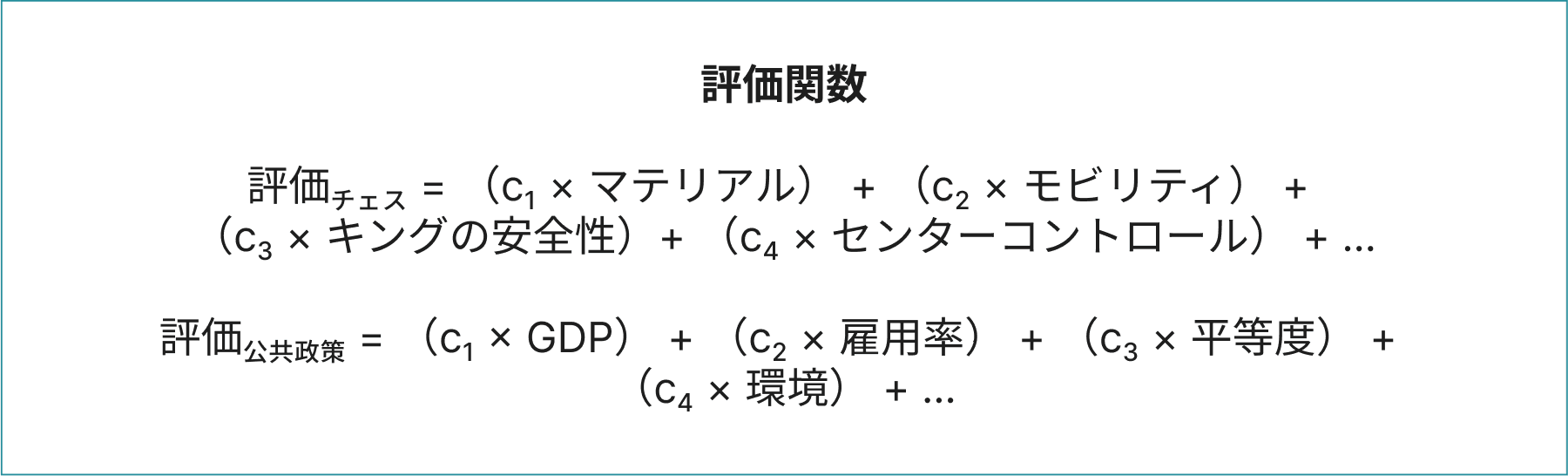 そこで、その代わりにあなたがやらねばならないのは、数手先を確実に計算することです。十数手先くらいでしょうか。そこまで行ったところで分析はとめなければならず、なのでこの場合、あなたは比較的計算するのが簡単な評価関数をもつことになります。この関数は、この六つの手と応手の一連の流れから出来上がる盤面を見て、その盤面の良さをやっつけで評価するものです。チェスの評価関数の典型例は、次のようなものです。