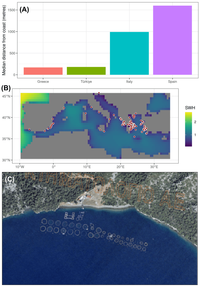 Figure 1. Farm physical characteristics. A = median distance from coast by country; B = coordinates of some farms (red points) visualised against significant wave height (SWB) in metres; C = aerial image of a typical fish farm, in this case a near-shore farm in Greece. For B, data are the mean significant wave height 2001 to 2016 for farms with known coordinates (incomplete for Türkiye and Italy). For C, the horizontal extent of the aerial photograph is 0.01 decimal degrees (roughly 800 m). Data in panel A from Hofherr et al (2015); B from Hersbach et al (2023), using Copernicus Climate Change Service information and farm coordinates from European Marine Observation and Data Network and Clawson et al (2022); C from https://gis.ktimanet.gr/ under CC BY 3.0.