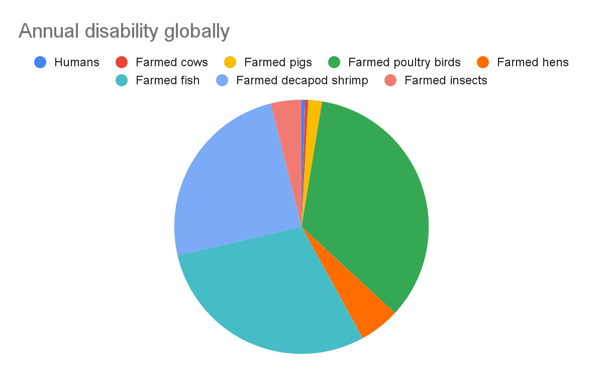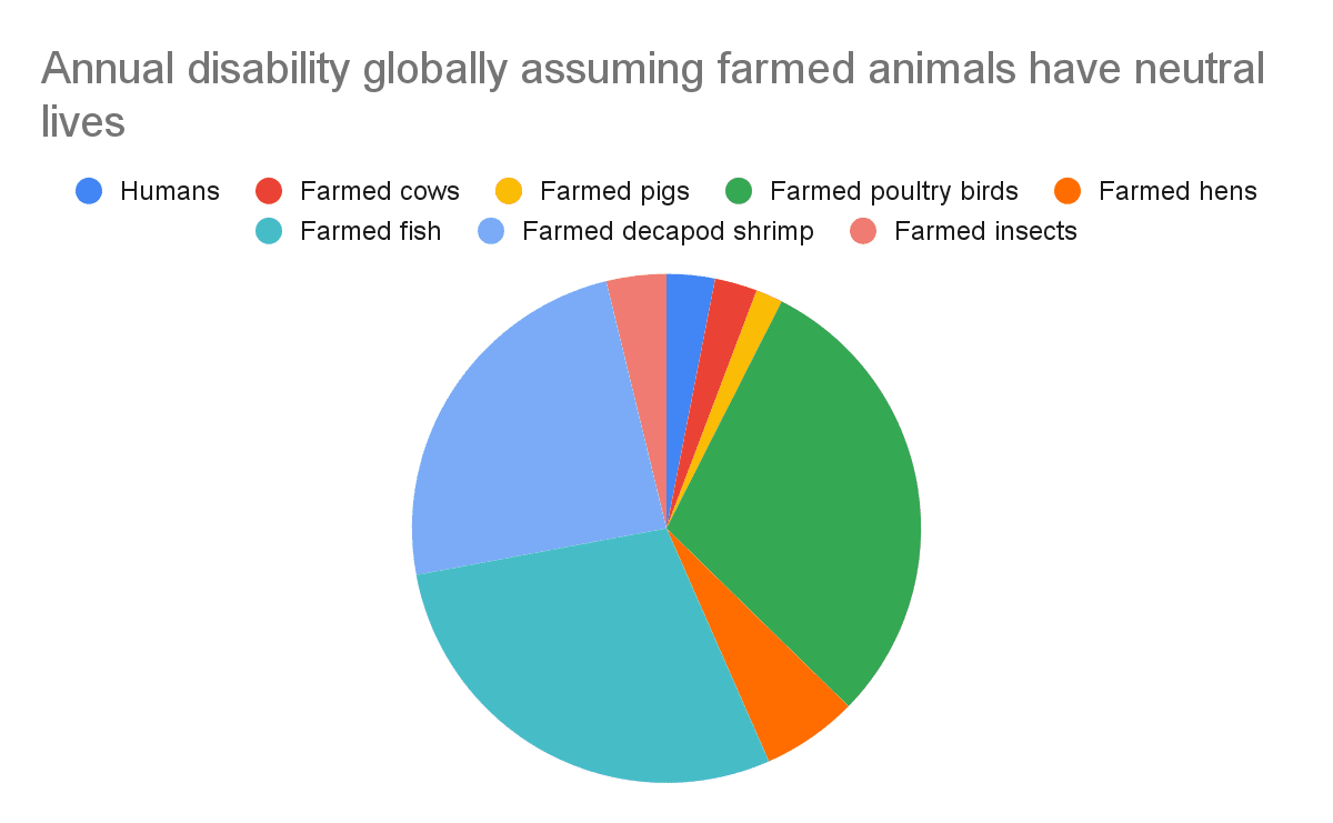 - The annual disability of farmed animals is much larger than that of humans, even under the arguably very optimistic assumption of all farmed animals having neutral lives.